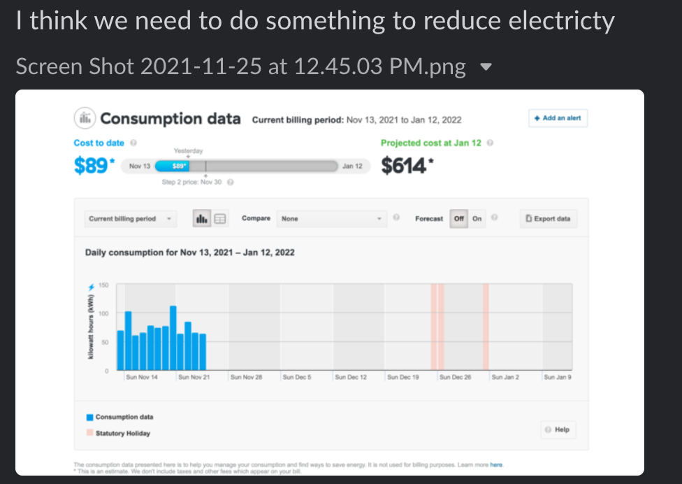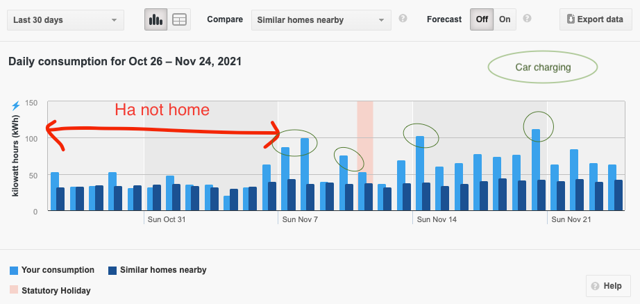 Đầu tháng lúc mình đi công tác và đi thăm gia đình bên bờ Đông Canada, mức sử dụng điện nhà mình chỉ ngang nhà hàng xóm. Nhưng từ khi mình về thì cao hơn hẳn luôn.