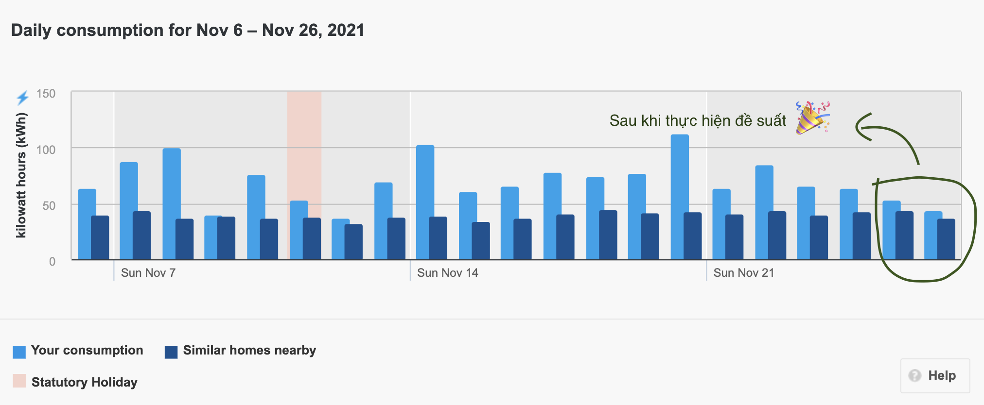 Rất hên, mình có thể so sánh với hai thứ mà mình biết: (1) Bill tiền điện từ trước đến giờ của mình, và (2) Trung bình mức dùng điện của các hộ hàng xóm xung quanh (được cung cấp bởi BC Hydro - công ty điện lực ở tỉnh bang British Columbia, nơi mình ở)
